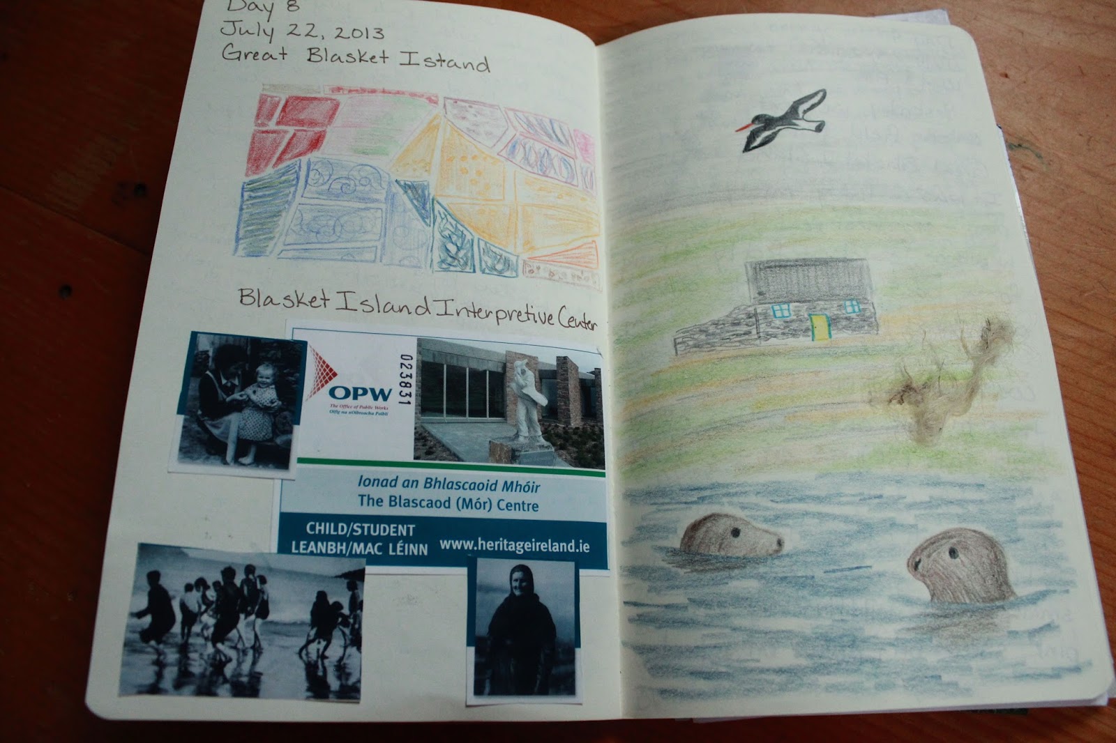 Also, I never did learn how to watercolor paint. (What looks like a dirty smudge on this picture, above the seals, is really a glued-in bit of Blasket Island sheep wool).