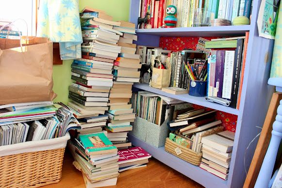 Finally (but not really finally), another problem that corresponds to one of my own: the growing book collection necessitated a bookcase. I made this one with more pieces of plywood--they have an angle at one end, and I made use of this to create a dictionary-stand-type bookshelf--and a toothpick (to keep the books from sliding off the top).